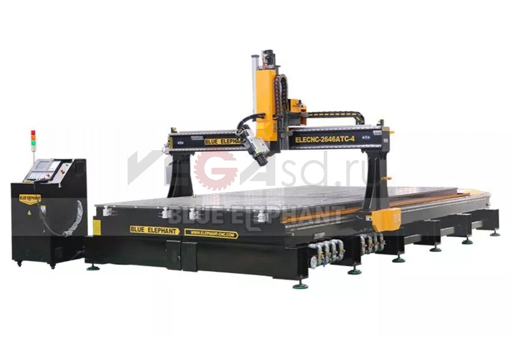 Модель ELECNC2646ATC-4A Перемещение по осям X, Y 2600x4600 мм, опционально: 1300х2500 мм; 2000х3000 мм; 2000х4000 мм и т.д. Перемещение по оси Z 500 мм, опционально: 600 мм, 400 мм и т. д. Тип шпинделя Шпиндель воздушного охлаждения ATC мощностью 9 кВт, ER32 Тип инвертора 11 кВт Поворотное устройство Опционально: Поворотное устройство Комплект инструментов Устройство автоматической смены инструмента линейного типа Держатель инструмента с цангой ER32: φ4, φ6, 1/8, 1/2 Система контроля Тайваньский LNC-контроллер Система вождения Серводвигатель и сервоприводы Leadshine мощностью 1300 Вт. Опционально: японский сервопривод Yaskawa Редуктор SHIMPO редуктор Структура машины Прочный корпус с закалкой Рабочий стол Алюминиевый Т-образный паз и вакуумный рабочий стол Позиционирующий цилиндр 7 шт. (X2, Y3) Линейная направляющая Тайваньская линейная направляющая с защитой от пыли Трансмиссия Ось X, Y: Тайвань/Германия. Спиральная зубчатая рейка и шестерня.