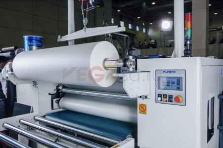 В станке встроена УФ-лампа для желирования слоя лака под ПЭТ пленкой, чтобы на выходе пленка легко отделялась от слоя ЛКМ, а текстура пленки, перенесенная на лак, сохранила свою форму.