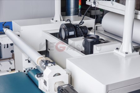 Автоматическая подача ПЭТ пленки из рулона через систему роликов для обеспечения ровной подачи без замятия и смещения пленки, а также надежного прижима пленки к лаковому слою, нанесенному на заготовки.