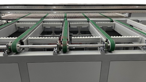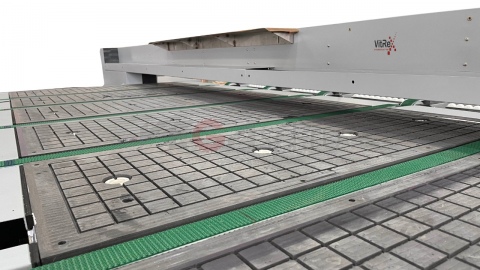 Набор конвейерных лент позволяет стеклу, МДФ, металлу, керамике и другим плитным материалам перемещаться от погрузки до разгрузки. может иметь до 7 конвейерных линий. VitReX 3321 BL имеет в базовой комплектации 5 конвейерных линий, которые могут передвигать минимальный размер материала 2400 мм х 1200 мм. Дополнительные конвейеры могут быть добавлены для передачи меньших размеров.